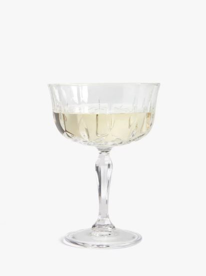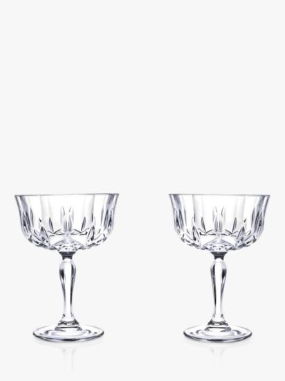 - A pair of wine glasses with long stems and wide saucer-shaped bowls, designed for enjoying sweet champagnes and cocktails. Made from pressed glass with a traditional cut glass effect pattern.